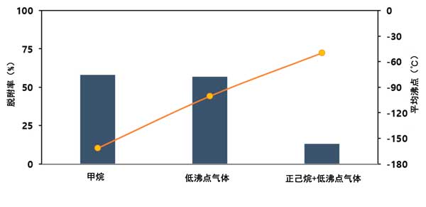 在本研究中的吸附劑中,果殼活性炭對四種低沸點(diǎn)THC氣體表現(xiàn)出最高的有效吸附能力。在現(xiàn)場條件下,使用低沸點(diǎn)和高沸點(diǎn)混合THC氣體。這里描述的實(shí)驗(yàn)是在不同的進(jìn)料條件下進(jìn)行的,如下:(1)100ppm甲烷(bp-162℃),(2)100ppm低沸點(diǎn)THC(乙烯bp-103.7℃,乙烷bp)-89℃,丙烯沸點(diǎn)-47.6℃,丙烷沸點(diǎn)-42℃),以及混合THC,包括30ppm己烷(沸點(diǎn)69℃)和70ppm低沸點(diǎn)THC,在果殼活性炭下進(jìn)行100毫升/分鐘。如圖4所示,甲烷、低沸點(diǎn)THCs和混合THCs的有效吸附容量分別為0.0462mg/g、0.072mg/g和2.884mg/g。這些結(jié)果表明沸點(diǎn)與有效吸附容量成反比。