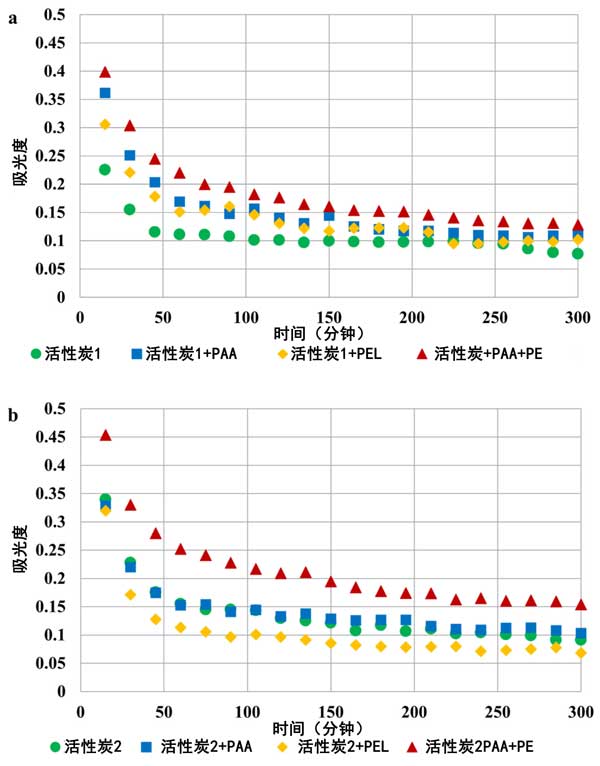 圖5:?jiǎn)我缓投劫|(zhì)系統(tǒng)中活性炭1和活性炭2懸浮液在pH3時(shí)150分鐘后的吸光度。