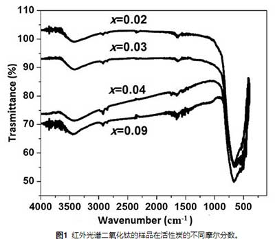 圖1示出了TiO 2的樣品的紅外光譜在活性炭的不同摩爾分?jǐn)?shù)。對(duì)于浸軟的手動(dòng)獲得的化合物,譜圖顯示在3440cm -1處的譜帶,這與H-OH振動(dòng)模式應(yīng)力相關(guān)聯(lián),并且透射率或紅外吸收碳隨著濃度的降低而增加。由于活性炭的存在,在2908cm -1處發(fā)現(xiàn)了由于芳香族基團(tuán)的CH鍵而形成的譜帶,觀察到該譜帶通過降低碳含量而急劇下降。1630cm -1處的帶對(duì)應(yīng)于水彎曲模式。具體看1000到400厘米-1寬帶被定義為活性碳含量增加。該區(qū)域的特征譜帶位于680 cm -1處,可與官能團(tuán)Ti-O-Ti和官能團(tuán)Ti-O的振動(dòng)模式相關(guān)聯(lián)。通常,在圖1中觀察到強(qiáng)度隨著活性炭含量的降低而增加,這表明在低的碳摩爾分?jǐn)?shù)下各種結(jié)合的形成更強(qiáng)。