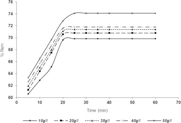 圖、3接觸時間和不同活性炭劑量對從BRE(BRE體積= 20ml,C 0 = 161.92mg / l,初始BRE pH,原始溫度= 25℃)中去除SDP%的影響。