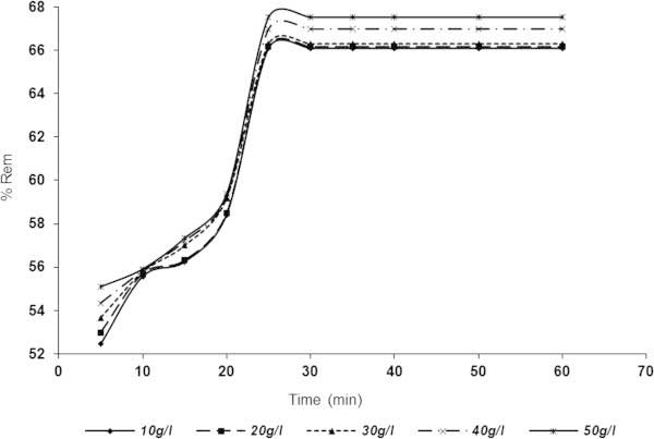 用于吸附除去SDP的相對于時間和吸附劑劑量的結(jié)果示于圖2,3在10-50克/升的范圍內(nèi)。圖 5和6表明,SDP去除與在吸附劑用量增加而增加。從圖中可以看出,對于活性炭1(圖2)和活性炭2(圖 3),平衡時間為30分鐘后,顆粒截留迅速增加并趨于恒定 。從圖 5中,活性炭1在10g / l時的去除百分?jǐn)?shù)分別為5和30-60分鐘時的60.5978和69.8369%。對于活性炭1(圖 2),分別以50g / l,63.3152和74.1168%記錄5分鐘和(30-60)分鐘。在圖3(活性炭2)中描繪了類似的趨勢, 其中在10g / l劑量下分別在5分鐘和(30-60分鐘)達(dá)到52.4456和66.1005%。對于50g / l 活性炭2劑量,分別在2和(30-60)分鐘時達(dá)到55.095和67.527%的去除率。結(jié)果表明,活性炭1在本實(shí)驗(yàn)條件下表現(xiàn)優(yōu)于活性炭2。