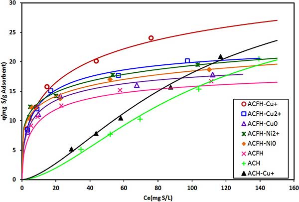 BT,DBT和4,6-DMDBT在浸漬有不同銅或鎳物種的活性炭纖維上的吸附等溫線如圖1,圖2和圖3所示。將實驗吸附數(shù)據(jù)擬合到LF模型并繪制以顯示這些圖中的整體等溫線趨勢。大部分吸附劑的吸附數(shù)據(jù)符合LF模型,相關(guān)系數(shù)大于0.94。與活性炭纖維等溫線不同,兩種介孔活性炭和ACH-Cu +的 DBT等溫線碳含量較低,相關(guān)系數(shù)分別為0.81和0.86。在低濃度(<50mg S / L)下觀察到的微孔活性炭纖維的較高吸附親和力是由于DBT在高能超微孔中的吸附所致;钚蕴坷w維等溫線也類似于標準I型等溫線。然而,對于中孔活性炭,觀察到等溫線的線性趨勢,表明在測試濃度范圍內(nèi)具有相似的吸附親和力。盡管微孔碳在〜200mg S / L的平衡濃度下達到其最大TC容量,但是兩種測試的活性炭在較高濃度(>200mg S / L)下預(yù)計具有更高的容量。我們的結(jié)果表明,銅或鎳浸漬提高了活性炭的吸附能力。然而,這項研究量化了不同單個金屬物種對噻吩類化合物吸附的重要性。這項工作的一個具體的方法中,對吸附劑(所述金屬浸漬之前)到高溫氫還原除去活性炭的酸性氧官能團。因此,可能作出的貢獻的氧酸性基團可以排除在外。所有活性炭纖維具有相似的微孔性和可比的超微孔性。因此,活性炭對噻吩類化合物的吸附增強主要歸因于特定負載的銅和鎳物質(zhì)的影響。