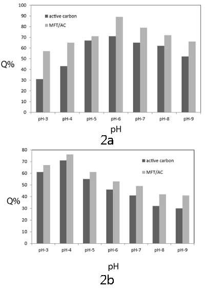 初始pH的影響:初始pH對鉻和鋅離子的去除效率的影響在pH(3-9)的范圍內(nèi)進行研究,并在(圖2a和2b)中表示。通過在含有50mL初始濃度為100mg / L的50mL重金屬溶液的燒杯中,將0.05g MFT/活性炭或活性炭浸泡在25℃下,并且以210KHz聲強度,以7.7W /厘米1小時。如圖2所示,由于pH影響金屬離子和MFT官能團的化學性質(zhì),MFT / 活性炭從水溶液中去除中的金屬離子是pH依賴性過程。在所有pH值范圍內(nèi),MFT / 活性炭的去除系數(shù)大于活性炭的去除系數(shù)。對于鉻離子,去除Cr 3+的系數(shù)離子從pH3增加到6,在pH6達到最大值。在pH = 6時,約91%的鉻離子從溶液中去除。在pH范圍(7 - 9),去除系數(shù)略有下降。對于鋅離子,去除系數(shù)在pH4時達到最大值,鋅離子去除率達到74%,然后明顯下降。在中性或微酸性介質(zhì)中,吸收可能是由于樹脂 - 金屬離子絡合物的穩(wěn)定形成,由于配位羧酸根釋放H+,可能導致介質(zhì)酸度增加。在較高的pH值下,重金屬離子將水解成Cr(OH)+和Zn(OH)+,因此,重金屬正電荷減少到+1,這使得與螯合劑的低相互作用除了金屬氫氧化物可以沉淀。