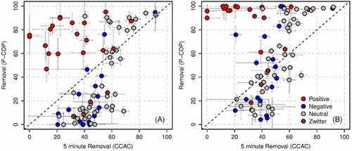 圖2.比較在(A)等效質(zhì)量基礎(chǔ)和(B)等效表面積基礎(chǔ)上進(jìn)行的批量實(shí)驗(yàn)測量的每種微污染物與P-CDP或活性炭接觸5分鐘后的百分比去除率。每個(gè)面板中的誤差線代表五次測量的標(biāo)準(zhǔn)偏差。顏色表示在進(jìn)行實(shí)驗(yàn)的pH(pH = 7)下微污染物的電荷狀態(tài)。