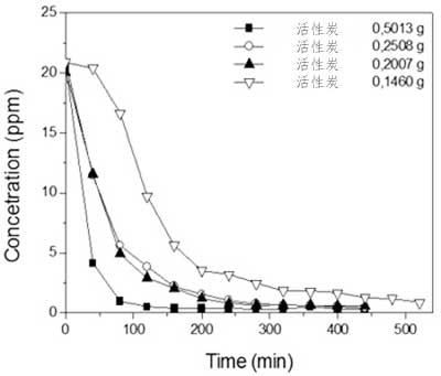 圖1.顯示了質(zhì)量對(duì)活性炭吸附曲線的影響,證明在進(jìn)行鎳研究時(shí)使用較低質(zhì)量來(lái)分析使用該材料可能的吸附容量和飽和時(shí)間的變化。