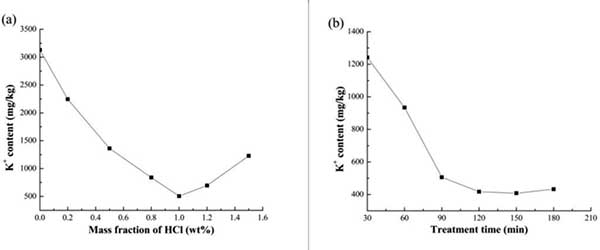 在本文中,首先用氯化氫溶液處理活性炭(AC-W)樣品以除去鉀離子。詳細(xì)研究了氯化氫溶液的處理時間和質(zhì)量分?jǐn)?shù)的影響。從圖1(a)可以看出,氯化氫溶液的質(zhì)量分?jǐn)?shù)與鉀離子含量之間的關(guān)系為90 min。圖中還顯示隨著氯化氫溶液質(zhì)量分?jǐn)?shù)從0增加到1.0 wt%,鉀離子含量呈現(xiàn)明顯的下降趨勢。過量的酸根離子導(dǎo)致鉀離子在電雙層過程中從交流困難中消除,形成于鉀離子表面。因此,HCl溶液的最佳質(zhì)量分?jǐn)?shù)為1.0重量%。