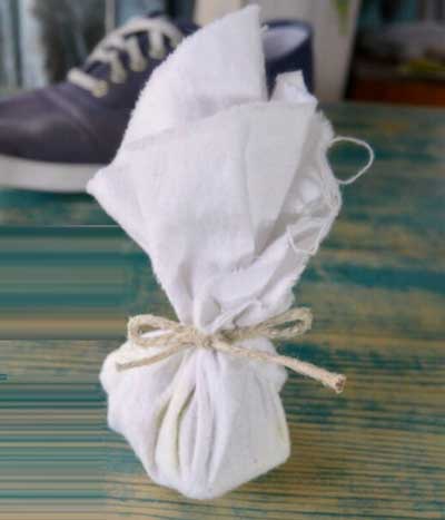 你的活性炭已經(jīng)填裝到咖啡過(guò)濾紙上了,精油也滴上去了,F(xiàn)在只要盡可能緊地包裹過(guò)濾紙,同時(shí)將角落塞入以防止活性炭泄漏。如果您想要格外謹(jǐn)慎,可以使用一小塊膠帶密封好,并在下一步中保持開(kāi)啟狀態(tài)。