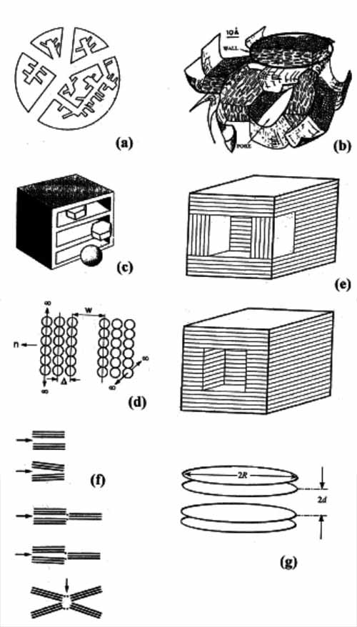 圖1:活性炭孔隙率模型,(a)徑向分布圓柱孔網,(b)皺紙,(c-d)狹縫狀孔,(e)立方體狀狹縫狀孔,(f-g)微晶方法。