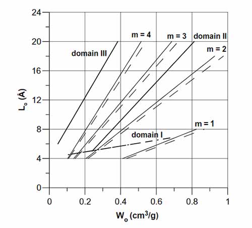活性炭孔隙率遵循三個線性結構域所示的常見趨勢。這一事實表明存在著由不同前體和精制路線的固體部分共同形成的共同形態(tài)。根據這些多孔固體的近期和各種已發(fā)表的特征,它們的孔壁由基本結構單元的空間排列構成,所述基本結構單元由層疊的石墨烯層組成。為了減少模型中的參數數量,結構被描述為圓盤狀顆粒,其直徑的特征在于石墨烯層中涉及的苯環(huán)的數量,并且其厚度由堆疊層的數量和層間距離。用于工業(yè)宏觀尺寸盤狀顆粒堆積的可用經驗相關性已經應用于那些納米級結構,導致在chars和碳分子篩觀察到的實驗微孔體積范圍內的值。