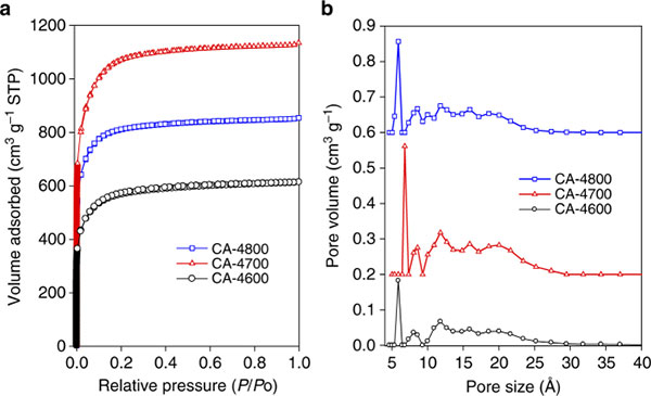 圖1、活性炭的孔隙率;罨奶急粯擞洖镃A-4T,其中4是活化KOH/碳比,T是活化溫度。顯示了氮吸附等溫線(a)和相應(yīng)的孔徑分布曲線(b)。