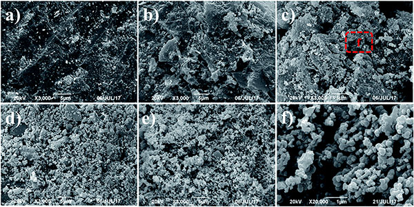 圖1、不同氧化鎂含量的改性活性炭的圖像:(a)活性炭,(b)活性炭中氧化鎂含量5%,(c)活性炭中氧化鎂含量10%,(d)活性炭中氧化鎂含量20%,(e)活性炭中氧化鎂含量30%和(f)活性炭中氧化鎂含量10%放大的SEM圖像。