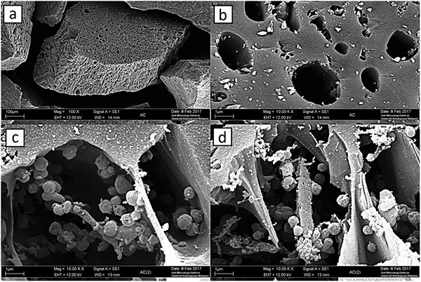 圖中(a)單個(gè)多孔活性炭在100倍放大的視圖,(b)高度多孔,不規(guī)則結(jié)構(gòu)化活性炭C在10000倍放大倍數(shù)下的特寫視圖,(c)和(d)細(xì)菌批量培養(yǎng)后,放大10000倍,負(fù)載固定在活性炭上。