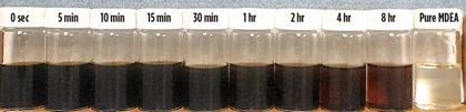 圖4顯示與含有含有活性炭8小時(shí)的MDEA的小瓶相比,不含活性炭的受污染的MDEA的顯著顏色變化。這很可能是因?yàn)榛钚蕴课搅穗s質(zhì)并澄清了MDEA溶液。還觀察到粘度變化但未測(cè)量。