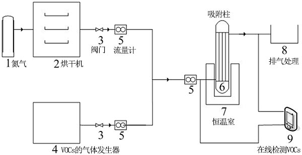 在吸附柱中研究了活性炭吸附甲苯的能力;钚蕴康挠昧繛10g,吸附質(zhì)甲苯氣體由氣體發(fā)生器產(chǎn)生。通過測定吸附前后甲苯的濃度,得到了不同條件下活性炭吸附性能的數(shù)據(jù)。實(shí)驗吸附裝置的流程圖如圖2所示。將來自氣體發(fā)生器的甲苯氣體與氮?dú)饣旌,然后將其吸附在恒溫吸附塔中。通過在線FID檢測器測量吸附前后的甲苯含量,并通過流量計控制甲苯流量。當(dāng)脫氣和入口濃度在30分鐘內(nèi)保持一致時,認(rèn)為已達(dá)到吸附平衡。吸附氣體通過廢氣出口排空。