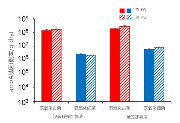 當活性炭內(nèi)的生物活性在冬季降低時,在凝結/沉淀之前實施預氯化或斷點氯化以化學除去原水中的銨。此外,氯是一種有效的消毒劑,用于控制飲用水系統(tǒng)中的微生物活動和生長。據(jù)了解,預氯化對活性炭的氨氧化性能以及AAC和AOB在活性炭上的豐度具有強烈的負面影響。