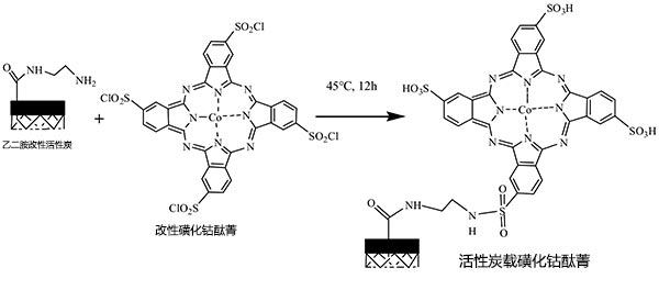 活性炭本身的孔隙結(jié)構(gòu)發(fā)達,擁有大的比表面積和高吸收率與穩(wěn)定性。然而,活性炭按平常的方法浸漬磺化酞菁鈷催化劑會存在負載型催化劑的活性成分損失的問題,導致再利用性能不令人滿意。因此,應通過化學接枝方法在活性炭上載入CoPcS。
