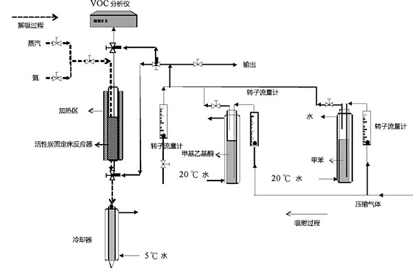 在稱重后將活性炭重新安裝到反應(yīng)器中。然后將閥門切換到解吸過程。將冷卻器的溫度設(shè)定為5℃,并加熱加熱帶直至達到解吸介質(zhì)的所需溫度(100℃或130℃)。解吸時間為10分鐘。當反應(yīng)器的中心達到約35℃時,將解吸介質(zhì)引入反應(yīng)器中。然后收集解吸的溶劑。當滿足設(shè)定的解吸時間時,終止加熱和解吸介質(zhì)并且溫度開始下降。此后,將吹掃的壓縮空氣注入(在某些實驗測試中使用氮氣)到反應(yīng)器中,直到中心溫度降至室溫。收集解吸的溶劑并稱重用于計算活性炭的工作容量。工作容量定義為吹掃后飽和VOC吸附容量與碳上殘余VOC的差值。然后使用氣相色譜儀分析溶劑的組成。