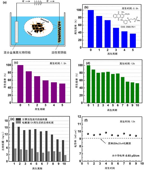 圖1。再生時間對RE和總有機碳(TOC)去除的影響。(a)設(shè)置示意圖。(b)-(d)當再生時間分別為0.5小時(b),1.5小時(c)和12小時(d)時,RE的變化。(e)再生12小時后的電解質(zhì)TOC,并計算吸附在活性炭上的RB19的TOC。(f)12小時后電解質(zhì)的電導率超過10次再生。