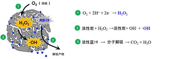 該方法的關(guān)鍵特征之一是沒有氧化劑或催化劑外部添加到系統(tǒng)中。過氧化氫電生成和OH生成都發(fā)生在負極化的活性炭上。因此,RB19分子,過氧化氫分子和OH自由基處于相同位置(活性炭的孔隙和表面),這有利于短壽命OH的RB19裂解。擴大此流程的關(guān)鍵是活性炭與當前不銹鋼網(wǎng)保持良好可靠的聯(lián)系。這種方法可以將吸附于活性炭內(nèi)的分子去除,再生活性炭的吸附能力,是一種比較好的活性炭再生方法。
