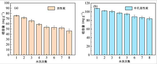 為了比較水洗再生對脫硫后活性炭樣品的影響,研究了硫容量與活性炭和中孔活性炭的循環(huán)次數(shù),如圖3所示;钚蕴康墓ぷ髁蛉萘靠傮w呈下降趨勢,第一次脫硫時為75.6 mg·g-1,第8次循環(huán)為46.2 mg·g-1,減少率為40.5%,如下圖所示。圖3a。結果表明,飽和吸附劑對H 2 SO 4的不完全解吸對循環(huán)SO 2有明顯的負面影響活性炭的吸附性能。用中孔活性炭觀察到類似的結果。然而,中孔活性炭的硫容量在8個循環(huán)后降低了22.0%,遠低于微孔活性炭的降低速率,這表明互連微孔和有序介孔的特性促進了H的解吸。2 SO 4并減少硫容量的減少。