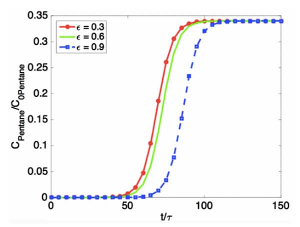 模擬三種不同孔隙率的活性炭的吸附動力學(xué)(圖2)。通過多組分加權(quán)平均計算C/C0(我們模擬每種組分的吸附動力學(xué),計算它們相應(yīng)的穿透曲線,并根據(jù)它們在原始油蒸氣中的體積分數(shù)得出加權(quán)平均值)。從圖3中可以看出,較高的孔隙率可以在較長的穿透時間內(nèi)重新產(chǎn)生,這與較高的孔隙率將導(dǎo)致較高的表面積并且將使反應(yīng)器中的吸附物的停留時間更長的事實一致。