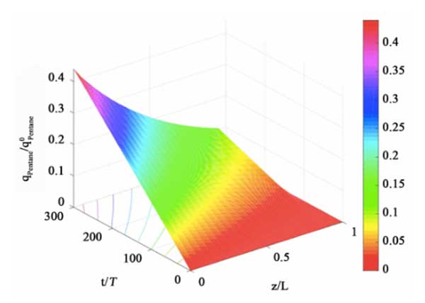 圖5:填充床反應(yīng)器中戊烷在活性炭吸附劑上的載荷的時空分布。