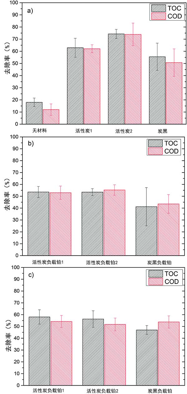 圖1:反應(yīng)4小時(shí)后魚罐頭廢水的APR去除TOC和COD,a)批次運(yùn)行中的活性炭與活性炭負(fù)載鉑催化劑b)分批運(yùn)行和c)半連續(xù)運(yùn)行。