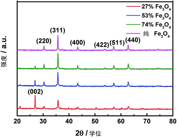 使用XRD衍射儀測量活性炭復(fù)合物的晶體結(jié)構(gòu)。圖1顯示了所制備樣品的衍射圖案。在2的特征衍射峰θ= 31.24°,36.82°,44.76°,55.62°,59.30°和65.19°的與(220),(311),(400),(422),(511)和(440)Fe 3 O 4平面一致。此外,在約2峰值θ=26.20°被分配給蓬松結(jié)構(gòu)化活性炭。觀察到Fe 3 O 4衍射峰的強度隨著Fe 3 O 4納米顆粒負(fù)載量的增加而增強,并且活性炭的強度在相同的過程中減少。上述現(xiàn)象表明Fe 3 O 4納米顆?梢猿晒Φ匾肱钏山Y(jié)構(gòu)的活性炭上。
