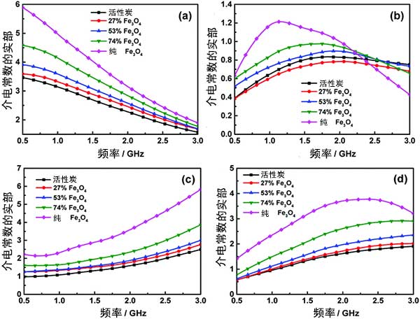 此外,研究了活性炭復(fù)合材料的電磁波吸收性能。圖4顯示復(fù)介電常數(shù)和導(dǎo)磁率,這些電磁參數(shù)對于確定微波吸收復(fù)合材料的介電和磁損耗非常重要,并且在吸收過程中電磁波的傳輸和反射也受它們的影響。從圖6(a)和(b)中,可以觀察到,所有樣品的介電常數(shù)的實部與增加頻率。圖6(c)和(d)顯示了磁導(dǎo)率的實部和虛部作為頻率的函數(shù)。觀察到當(dāng)活性炭的負(fù)載量低時,滲透率的實部僅略微增加。