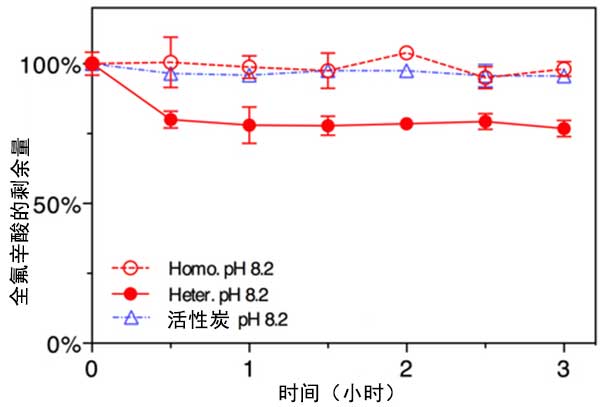 在存在和不存在活性炭的情況下,在密封的40mL燒瓶中在酸性,中性和堿性pH條件下進(jìn)行全氟辛酸與S 2 O 8的反應(yīng),反應(yīng)溫度為80℃,用恒溫水浴保持。對于大多數(shù)實(shí)驗(yàn),初始全氟辛酸濃度為0.5μM,活性炭濃度為200 mg/L,500 mg/L或1000 mg/L。對于酸性和堿性條件實(shí)驗(yàn),使用濃硫酸或150mM氫氧化鈉溶液將pH值調(diào)節(jié)至1.0或13.0。對于在pH 8.2下進(jìn)行的實(shí)驗(yàn),使用100mM硼酸鹽作為緩沖液(NaB(OH)4/H 3 BO 4)。在所有實(shí)驗(yàn)中包括五個重復(fù)。
