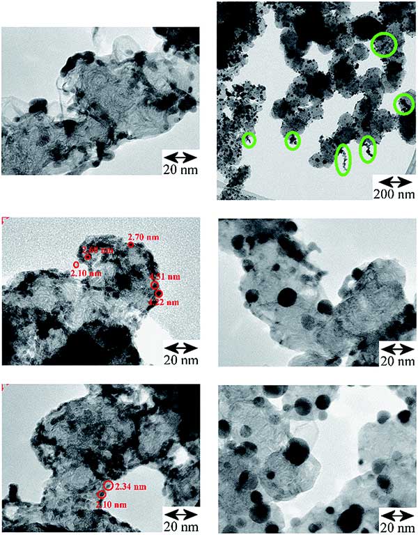 活性炭負載鈀催化劑的TEM比較顯示在圖1。左:原始活性炭,右頂部和中部:在300°C和底部:400°C下進行碳熱處理后,這會導致活性炭的顆粒增長,但之后聚集體大部分缺失孤立的較大平均尺寸增大的鈀微晶留在活性炭表面。右上:在300℃處理后的活性炭負載鈀的調(diào)查圖像,其中的橢圓形綠色標記突出顯示在400℃催化劑上不存在的殘余聚集體。顯示貴金屬實體的形狀,尺寸和形態(tài)之間的明顯差異。對于活性炭負載鈀,在多孔高表面積活性炭載體上/中存在大部分分離的初級顆粒。對于活性炭催化劑,主要存在線性聚集鏈和支化聚集體,在表面具有一些聚集體。熱處理導致大部分分離的初級顆粒尺寸增大,僅剩下少量聚集體或附聚物。