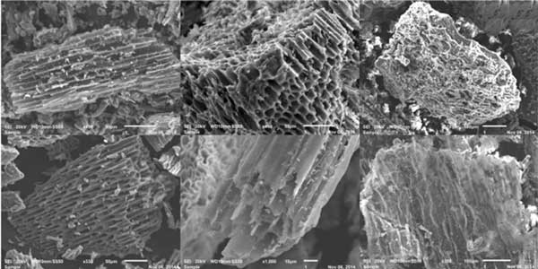 圖1:不同生物質材料制成的活性炭掃描電子顯微鏡圖像。