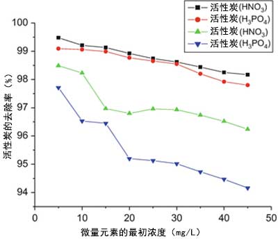 圖2:隨著初始濃度的增加,活性炭對(duì)鉛去除百分比的變化。
