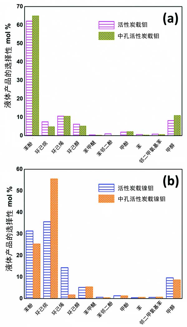 圖1:(a)活性炭載二硫化鉬催化劑(b)活性炭載鎳催化劑用于轉化愈創(chuàng)木酚的液體產物選擇性和轉換后的比較。