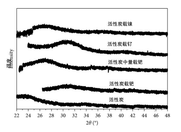 活性炭載三種金屬的衍射圖如圖2所示。在該圖中,可以看出金屬樣品或活性炭沒(méi)有確定的信號(hào),這可能表明所有樣品中都沒(méi)有結(jié)晶相,或晶體非常小(<100)。不存在結(jié)晶是由于樣品的低金屬負(fù)載量低于X射線衍射設(shè)備的檢測(cè)極限的結(jié)果。