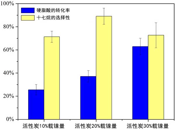 結(jié)果發(fā)現(xiàn)制備的活性炭載鎳催化劑并表現(xiàn)出優(yōu)異的脫羧活性和維持。硬脂酸可在370℃下完全轉(zhuǎn)化5小時(shí),對十七烷的選擇性約為80%。過量的鎳顆?赡軙枞欢康幕钚蕴靠紫恫p少孔隙體積。隨著高鎳負(fù)載量或催化劑負(fù)載量,裂解產(chǎn)物增加。溫度顯著影響硬脂酸的轉(zhuǎn)化,但不影響選擇性。具有大碳數(shù)的脂肪酸在活性炭反應(yīng)體系中易于裂化。