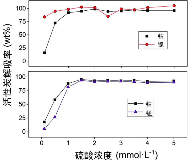 在使用活性炭成功吸附鈷之后,研究了用硫酸汽提以回收金屬離子并允許重復(fù)使用吸附劑。我們分別測(cè)試了三種回收參數(shù),實(shí)驗(yàn)發(fā)現(xiàn)低濃度的硫酸就足以去除大部分活性炭吸附的鈷(II),鎳(II)和錳(II)。由于僅有少量鎳(II)被吸附到活性炭上,因此解吸溶液中的鎳(II)濃度也很小。其結(jié)果是,對(duì)于鎳(II),元素分析的微小差異導(dǎo)致解吸百分比的相對(duì)大的差異,這可以在圖4中看出。