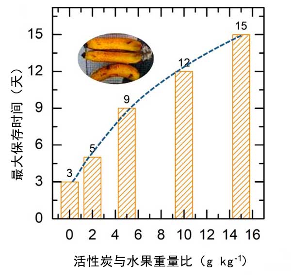 為了研究活性炭用量的影響,改變了活性炭和水果的質(zhì)量比。圖4顯示了活性炭與水果的保存時間與質(zhì)量比的范圍為;钚蕴康牧繒绊懕Y|(zhì)期,并且可以看到非線性相關(guān)性(見圖4中的虛線)。沒有活性炭達(dá)到存在,水果儲存時間僅為3天。根據(jù)添加的活性炭的質(zhì)量,保質(zhì)期可以從2天延長至12天。通過添加15克吸附劑用于1千克水果,可以實(shí)現(xiàn)延長高達(dá)5倍的保質(zhì)期。較高質(zhì)量的活性炭提供較長的保存時間,這可能是由乙烯吸附的活性位點(diǎn)含量較高引起的。結(jié)果表明,氧化鈷浸漬的活性炭有望用于延長水果的保質(zhì)期。