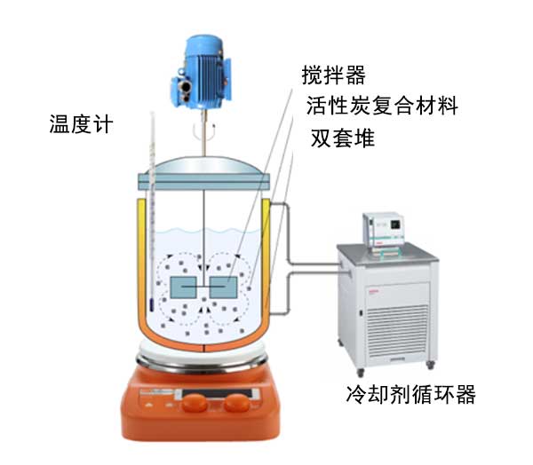 間歇式反應器系統(tǒng)已經(jīng)在實驗室規(guī)模中用于進行水中砷的吸附和去除過程。根據(jù)圖3,已經(jīng)使用的系統(tǒng)由雙頭反應器組成,其內(nèi)部容積為300cc,這是一種吸附反應的環(huán)境。在吸附過程中,循環(huán)器已用于轉(zhuǎn)移所需溫度并保持試劑流入反應器的第二壁。該反應器配備有機械攪拌器系統(tǒng),該系統(tǒng)可以在不同時期控制攪拌器的速度。在攪拌棒的末端,兩個平行葉片以高于反應器底部1厘米的角度放置,該反應器由聚合物和中性材料制成,目的是混合廢水和在吸附過程中使用在容器末端不吸附沉積的活性炭。該系統(tǒng)提供了研究吸附過程中混合速度的機會。為了提供所需的加熱,也可以使用配備有電加熱器的磁力攪拌器。兩種活性炭吸附劑和石墨烯/活性炭復合材料的砷吸附工藝已經(jīng)在45°C水中用含有三價砷的200cc廢水用700rpm的磨料攪拌器進行,其結(jié)果是相互比較。這些過程在不同時間和不同濃度的水中砷和不同濃度的活性炭和pH值下重復進行。