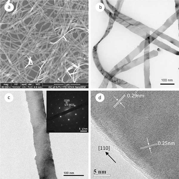圖1顯示了在活性炭上生長(zhǎng)的銀納米帶的典型電子顯微鏡(EM)圖像。SEM圖像(圖1a)顯示獲得了豐富的線狀產(chǎn)物,具有非常少的準(zhǔn)球形顆粒雜質(zhì)。圖1b是銀納米帶的典型TEM圖像。該圖中所示的納米帶的平均寬度為約45納米。從左側(cè)附近的扭曲納米帶測(cè)量的厚度為約9納米。位于TEM網(wǎng)格上的這種平坦且光滑的納米結(jié)構(gòu)也通過(guò)右側(cè)的莫爾圖案來(lái)證實(shí),其源自具有不同晶體取向的兩個(gè)或三個(gè)納米帶的堆疊。圖1c呈現(xiàn)單個(gè)納米帶的TEM圖像。其選擇區(qū)域電子衍射(SAED)圖案插入右上角,具有六重對(duì)稱(chēng)性。