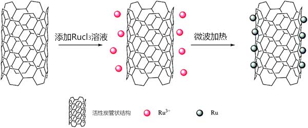 所有載釕活性炭上的釕負載量理論上為5%。通常,將活性炭加入120mL乙二醇中。并將混合物在超聲處理30分鐘以確;钚蕴烤鶆蚍稚。超聲處理后,在連續(xù)攪拌下滴加3.0mL RuCl 3水溶液30分鐘。然后是使用NaOH乙二醇溶液將混合物的pH調節(jié)至4.0。然后,在連續(xù)攪拌24小時后,將溶液放入微波合成反應器中加熱100秒。過濾混合物溶液,用去離子水洗滌直至濾液的pH達到7.0,并在80℃下真空干燥。將樣品研磨成粉末使用。由于活性炭的表面是疏水的,它們傾向于在極性溶劑中聚集。并且由官能團改性的活性炭可以提供足夠的孔隙以使釕納米顆粒均勻地分布在活性炭的表面上。在通過微波加熱的多元醇方法制備活性炭負載的釕納米顆粒。合成過程如圖1所示。
