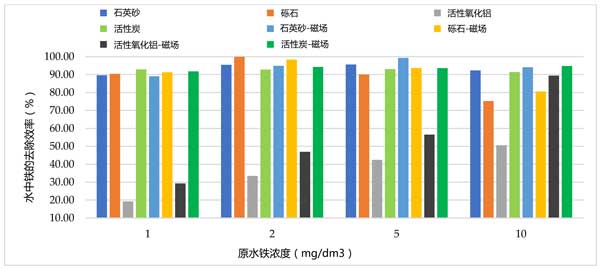 從水中除去鐵和錳可以通過許多常規(guī)方法進(jìn)行。通常,除鐵的本質(zhì)是Fe(II)離子氧化成Fe(III)并通過沉降和過濾從處理過的水中除去沉淀的Fe(OH)3沉積物。然而,脫錳包括將Mn(II)離子氧化成Mn(IV)和以MnO 2沉積物形式沉淀。用于從水中除去這些金屬的方法由它們在處理過的水中發(fā)生的形式?jīng)Q定。我們在水過濾和從水中去除鐵和錳的實驗方面有經(jīng)驗,并且已經(jīng)開展了一種新工藝的研究,該工藝可以通過傳統(tǒng)方法提高鐵和錳的去除效率。因此,進(jìn)行測試以確定磁場對活性炭的過濾過程的影響。水磁化實驗的目標(biāo)不是鐵還是錳氧化,影響的是水分子的排序。首先測試活性炭和其他吸附劑單獨(dú)對樣品水的過濾情況,發(fā)現(xiàn)僅在通過活性炭過濾的樣品的情況下,樣品中的鐵濃度至磁化低于對照樣品。在該床中除鐵的計算效率在對照樣品中約為83%,在磁化樣品中為93%(圖2)。在活性炭過濾過程中,鐵去除效率的差異計算為約3%,有利于用磁化處理的樣品。