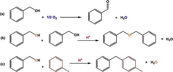 圖1所示,對于我們的銠活性炭催化劑,如果在布朗斯臺德酸中心存在下,芐醇氧化成苯甲醛可能發(fā)生平行反應:(a)苯甲醇氧化成苯甲醛(不需要酸中心)和副產(chǎn)物形成水。(b)兩分子芐醇縮合形成一分子二芐基醚,并除去水分子。(c)芐基化反應,包括從芐醇向甲苯分子中加入芐基碳陽離子(未顯示),并除去水分子以形成甲基-二苯基甲烷異構(gòu)體等。
