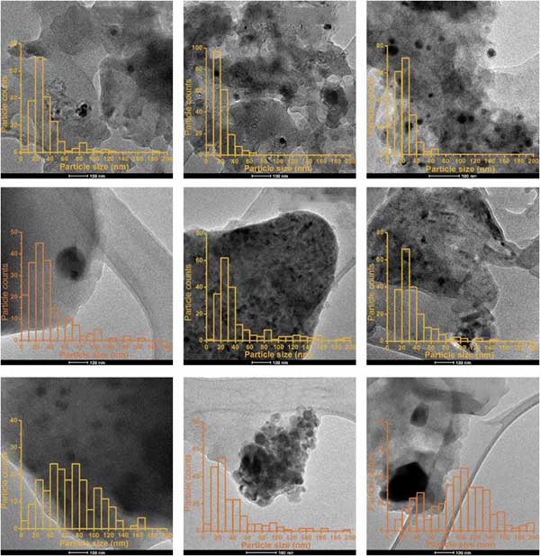 粒徑的變化在許多催化應用中是至關(guān)重要的,并且使用硝酸的原理正是為了誘導這些變化。為了通過實驗驗證該假設,對于所有九種載銠活性炭催化劑,通過TEM系統(tǒng)地評估Rh納米顆粒的粒度和分布。