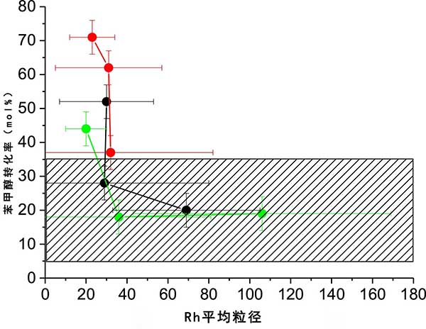 很明顯,這些粒徑范圍非常寬,我們認為考慮這樣的大顆粒對氧化反應具有活性是不現(xiàn)實的。在其它術(shù)語中,因子或參數(shù)是該預治療效果有在銠粒子的大小,但另外一個因素或參數(shù)是在銠粒徑變動的影響對催化活性。圖3值得注意的是,對于高于約的顆粒。30-40nm不再觀察到與催化轉(zhuǎn)化的變化或相關(guān)性,表明粒度不再是活性參數(shù)。我們認為該值是銠對芐醇氧化的活性的近似上限直徑,或者反過來對該反應有活性要求小于約30納米。我們認為這個結(jié)論雖然是一個廣泛的估計,但與未來基于這種金屬的催化劑開發(fā)相關(guān)。