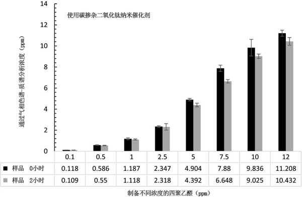 二氧化鈦摻雜的碳催化劑被認(rèn)為對水中的四聚乙醛降解無效,特別是與活性炭相比。圖3示出了前和2小時(shí)處理被碳摻雜二氧化鈦后在溶液聚乙醛的濃度2在UV-C光納米催化劑。在較高的初始濃度的金屬醛溶液如5、7.5、10和12ppm時(shí),與較低濃度的降解相比,降解稍微更顯著(2-9%)。