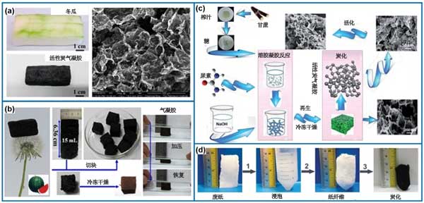 活性炭氣凝膠由納米結(jié)構(gòu)活性炭材料組成,其中孔隙充滿氣體。因為可以結(jié)合有益吸附性質(zhì)和高的熱穩(wěn)定性,并且擁有電子傳導(dǎo)性,和可成為催化劑載體,油或有機(jī)溶劑吸附和儲能方面的潛在應(yīng)用;钚蕴繗饽z還有一個特征是它們的超輕質(zhì)。除了高度多孔和輕質(zhì)之外,另一個優(yōu)點(diǎn)是在轉(zhuǎn)化成活性炭氣凝膠后引入導(dǎo)電性的可能性,因此允許在電化學(xué)區(qū)域(例如,電池,超級電容器或?qū)щ姶呋瘎┹d體)中的應(yīng)用。隨著新型活性炭材料的發(fā)展,已經(jīng)生產(chǎn)出具有超低密度和優(yōu)異導(dǎo)電性的石墨烯或基于納米碳管的活性炭氣凝膠作為新興的新型氣凝膠材料,這進(jìn)一步拓展了氣凝膠材料的應(yīng)用領(lǐng)域。除了高級碳材料能制造氣凝膠外,使用生物質(zhì)做成的活性炭氣凝膠如圖7所示。