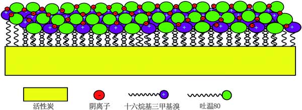 用表面活性劑改性的活性炭在電吸附過程中具有潛在的應(yīng)用,其中表面電荷和潤濕性起重要作用。用離子表面活性劑功能化的活性炭電極最近在電容去離子技術(shù),特別是反向電容去離子系統(tǒng)中引起了相當大的關(guān)注。圖3表明在用吐溫80和HDTMA的二元混合物改性的活性炭上吸附陰離子。吐溫80的存在表明HDTMA的吸附密度增強,完美填充(高穩(wěn)定性),這在電吸附過程中都是值得的。實際上,HDTMA的增強的吸附密度誘導(dǎo)了陰離子污染物的高吸附能力。此外,改進的填料賦予表面活性劑在表面上的穩(wěn)定性。這些特殊效果是混合表面活性劑體系應(yīng)用的最終目標之一,為了提高活性炭的表面活性,對于單一表面活性劑體系來說,這是不可能發(fā)生的。