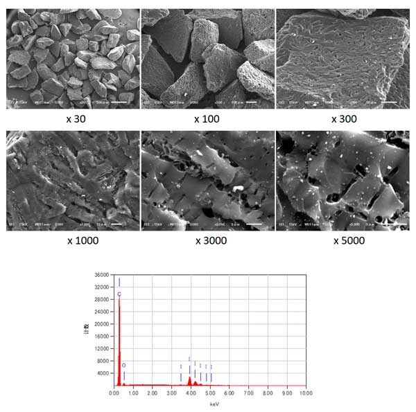 圖1: 基本碘浸漬活性炭的SEM圖像和EDS元素分析。