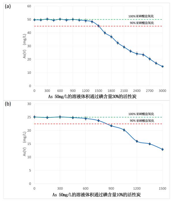 將5ml直徑為1.2cm的注射器裝入3cc的碘浸漬活性炭,以形成2.5cm長(zhǎng)的填充柱。將棉濾器置于柱的末端,以避免活性炭的損失。使用設(shè)定為10ml/分的蠕動(dòng)泵,將50mg/L砷溶液從頂部到底部連續(xù)地在柱中流動(dòng)。溶液通過(guò)柱子,從底部噴嘴排出,并以150ml的份數(shù)收集,用于定期pH監(jiān)測(cè)。此外,在完成每次150ml的回收之后,從塑料小瓶中的噴嘴取出從柱中排出的下列1ml溶液用于砷化學(xué)分析。當(dāng)50mg/L砷溶液的氧化效率低于90%(意味著砷酸鹽濃度低于45mg/L)時(shí),停止試驗(yàn)。